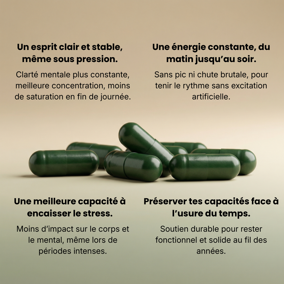 Ce complément s’adresse aux personnes qui souhaitent soutenir leur énergie cellulaire, améliorer leur vitalité globale, leur clarté mentale et leur capacité de récupération, notamment en période de fatigue, de stress, de charge mentale élevée ou de rythme de vie intense.